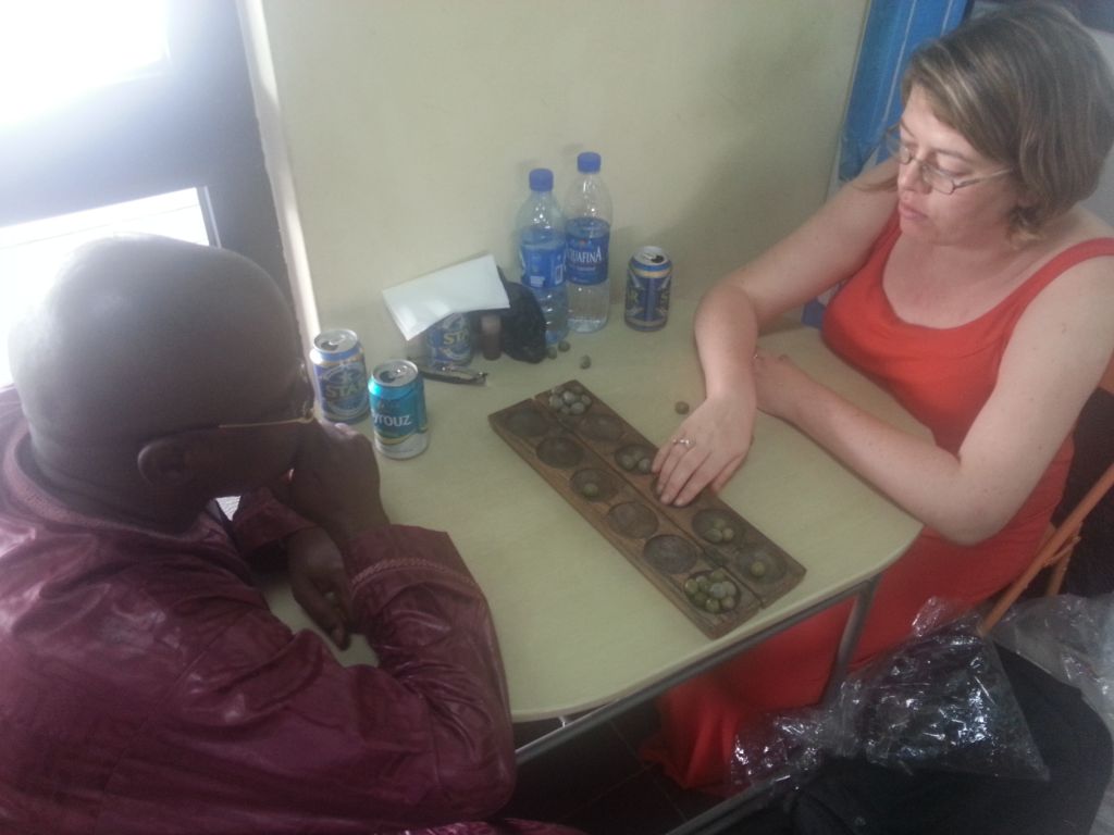 On our way home we were subject to a six hour delay to our internal flight to Lagos. After three hours spent processing expenses and other such tasks suited to a boring wait, we decided it was time for a beer and a game of ayo (we had bought it from one of the women we met). This caught the eye of a fellow stranded passenger. He was quite intrigued to see two white people with a grasp of this West African game. We played a few rounds, he taught us some new techniques and we had a chat about this and that.