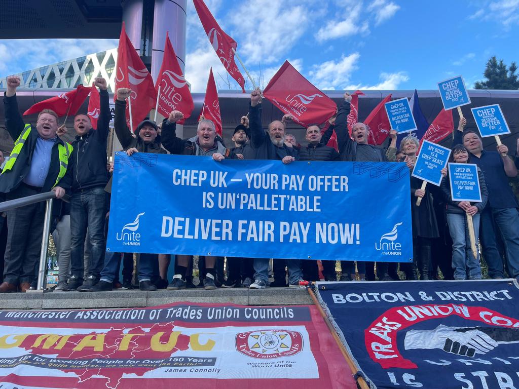 Gary described the picket line, which was in a prime spot on a busy road near the Trafford Centre. Hats off to whoever came up with the pun-tastic banner copy: ‘Don’t be a CHEPskate’. ‘Your pay offers are unPALLETable’.