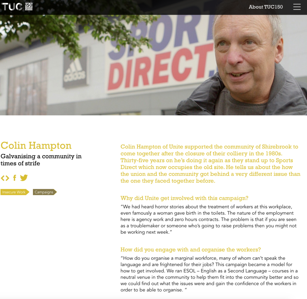150 stories was a huge undertaking – the biggest story gathering project we have ever led – but we delved into the TUC archives and got on the phone to the unionists of today and produced stories about some of the most inspiring activists in the country. Fancy looking at the ‘fantasy CV’ of Labour party founder, Kier Hardie? Ever wanted to know what a pre-The Royle Family Ricky Tomlinson said in the dock during his trial for union activities? And why did Jeannie Mole reject corsets?
